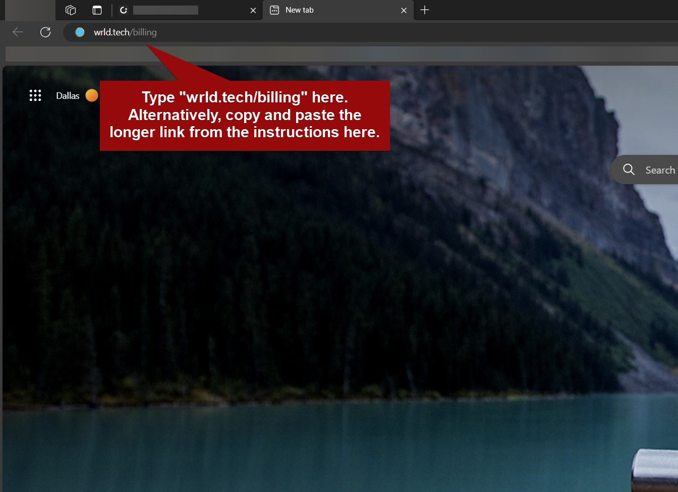 Open a new tab and type "wrld.tech/billing" to navigate to the billing portal.